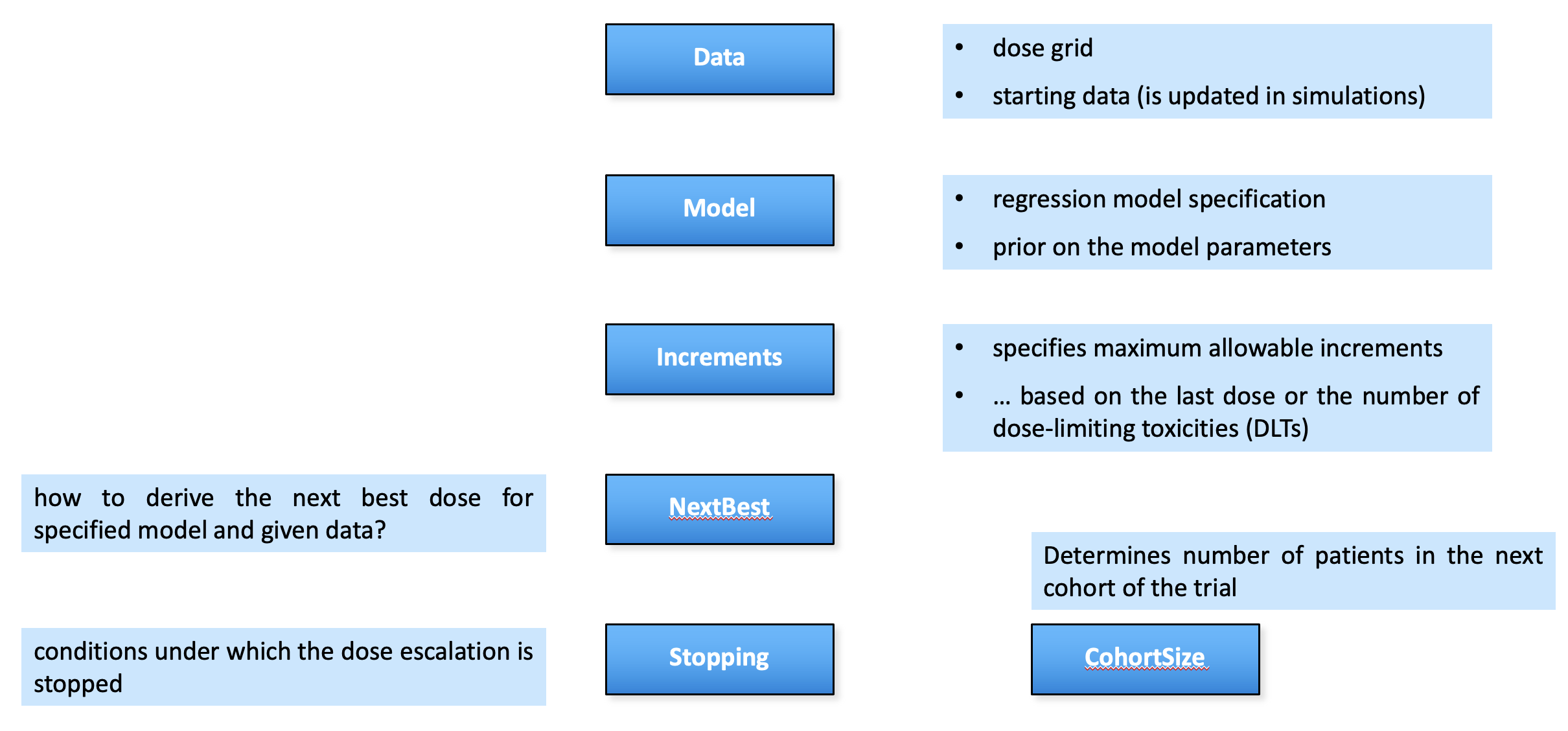 Together with the regression model, the definition of how to obtain the recommendation for the dose of the next cohort, are the key components of the model-based dose escalation design.