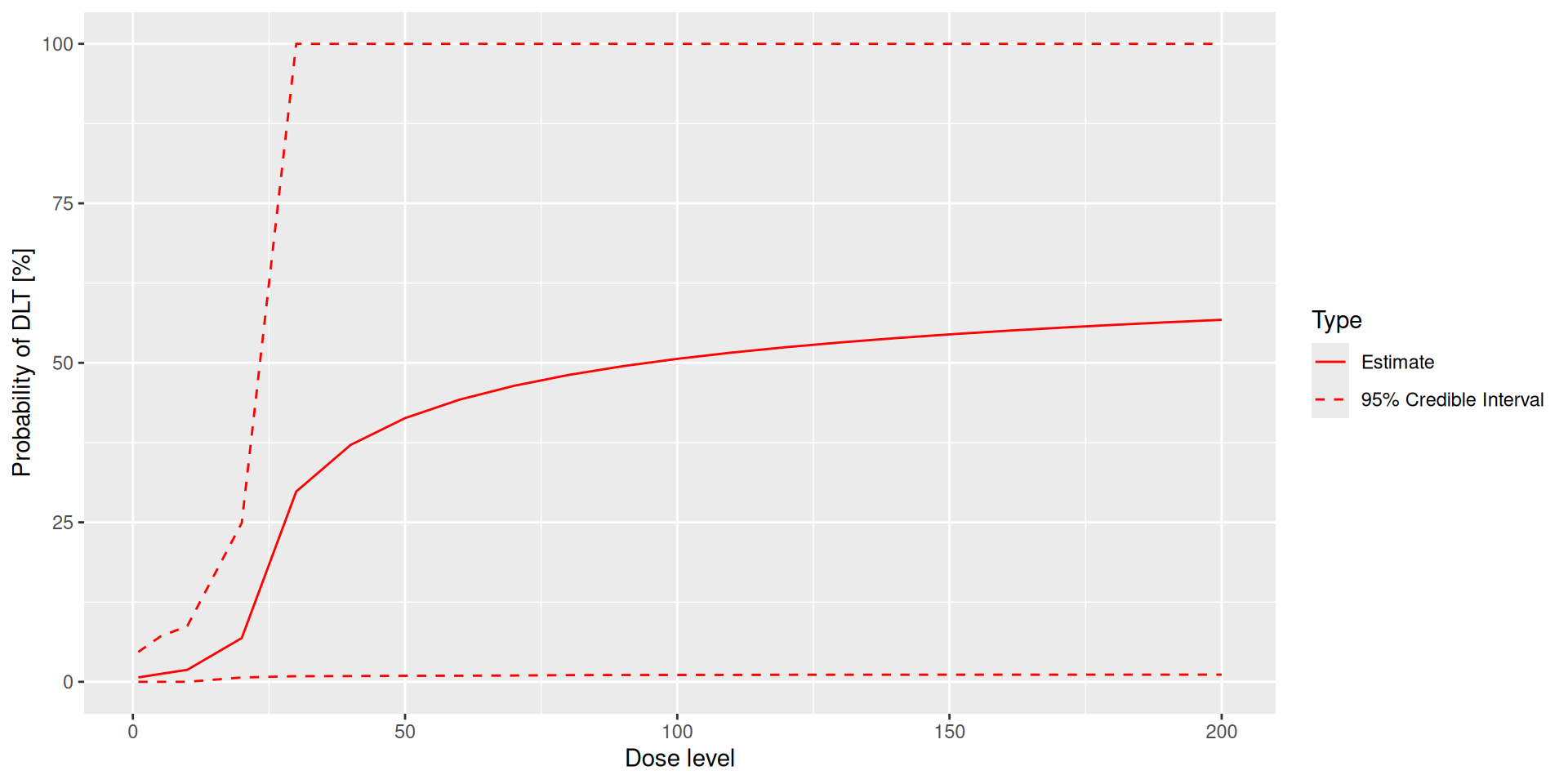 Here it could be also concerning that if we observe 3 DLTs at the starting dose of 5, we still continue with the same dose 5 for the next cohort. The reason here is that the prior is “too confident” that at low doses we have a low DLT probability.