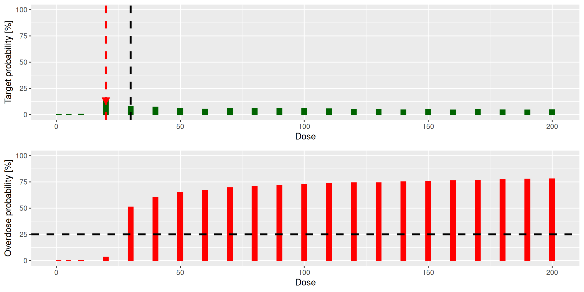 But we can also combine this with logical & and | operators with other stopping rules, e.g. to also stop if the target probability is high, or if the model would not recommend any dose at all because of safety concerns: