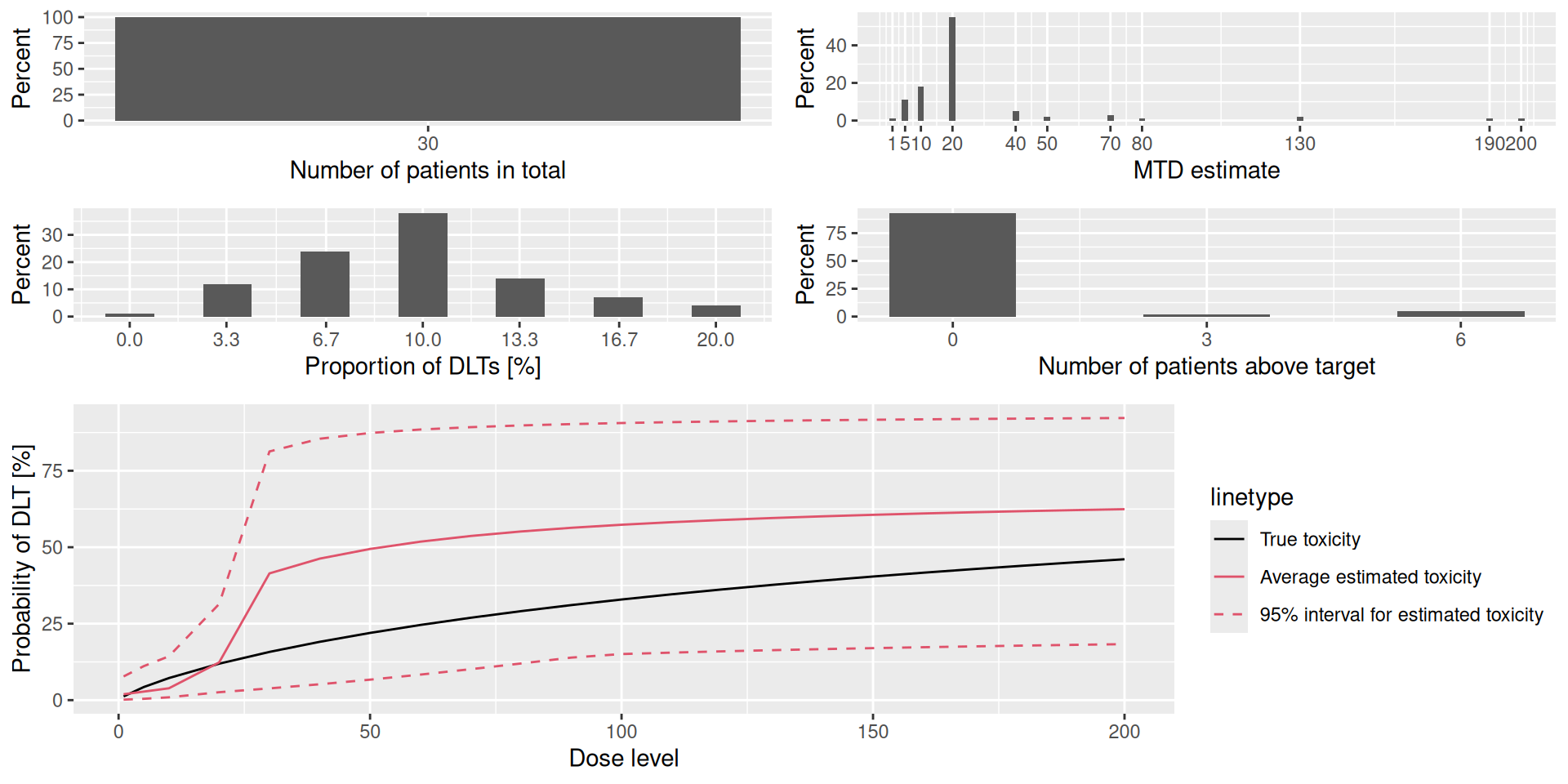 Proportions of DLTs in the trials : mean 10 % (3 %, 17 %)