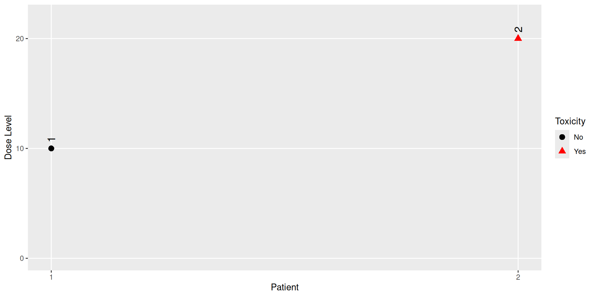 We can “update” the Data object with the information of a patient treated at dose 10, who did not experience a DLT, and a patient at dose 20 with a DLT:
